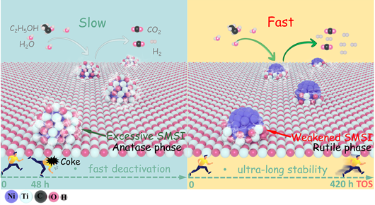 该研究利用TiO2晶相工程策略调变和稳定Ni/TiO2催化剂上的强金属-载体相互作用(SMSI),成功构筑了部分封装的Ni/r-TiO2催化剂,同时实现了金属Ni位点和Ni-TiO2周边界面位点的适度暴露,并克服了强金属-载体相互作用(SMSI)对高温富氢条件的结构敏感性,有效抑制了金属Ni烧结和积碳,从而在乙醇水蒸气重整制氢(ESR)反应中保持了长达420 h的高催化活性和结构稳定性。